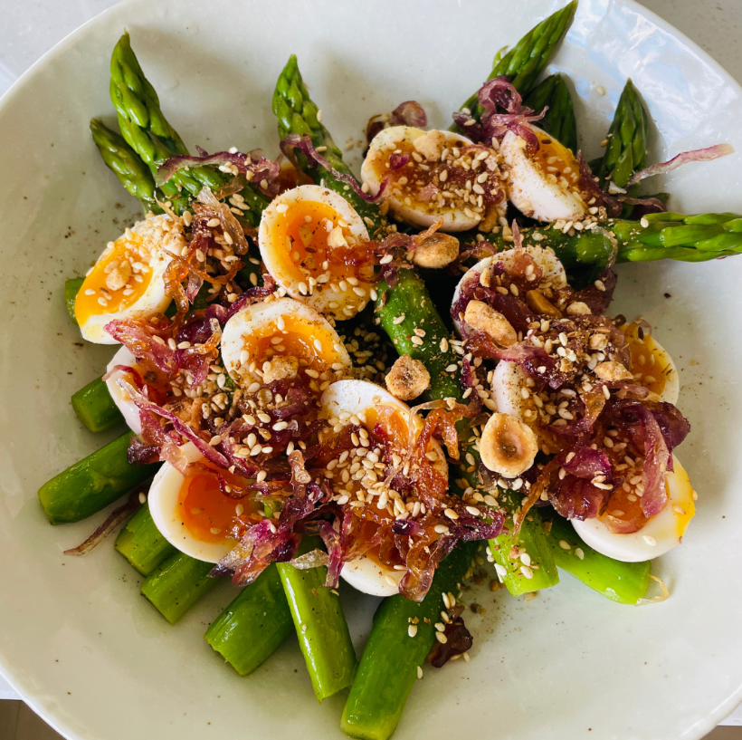Sałatka ze szparagami, jajkiem przepiórczym i przyprawą dukkah to propozycja elegancka, a jednocześnie zaskakująco prosta w przygotowaniu. Łączy w sobie chrupkość świeżo blanszowanych szparagów z delikatnością miękkich, płynnych żółtek jaj przepiórczych. Całość dopełnia wyrazisty biały winegret, który wnosi przyjemną kwasowość, oraz karmelizowana cebula o niemal dżemowej słodyczy.