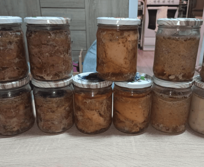 Sezon na przetwory warzywne dużymi krokami zbliża się do końca, więc czas na przetwory mięsne. Na głównym zdjęciu po lewej karkówka, w środku udka z kurczaka, po prawej mielonka, a ten pojedynczy słoik z prawej na dole to "samo robiące się zapasy" na trudne czasy, czyli obiad celowo ugotowany w nadmiarze,