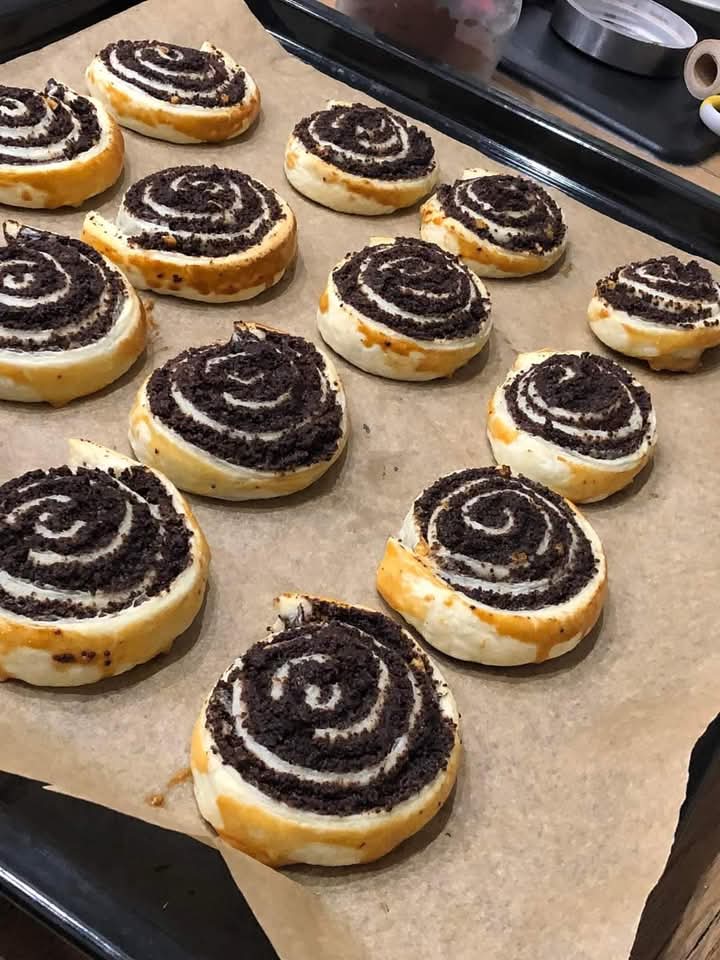 1. Rozwałkuj ciasto francuskie na blacie. Rozłóż masę makową i dokładnie pokryj nią całą powierzchnię ciasta.