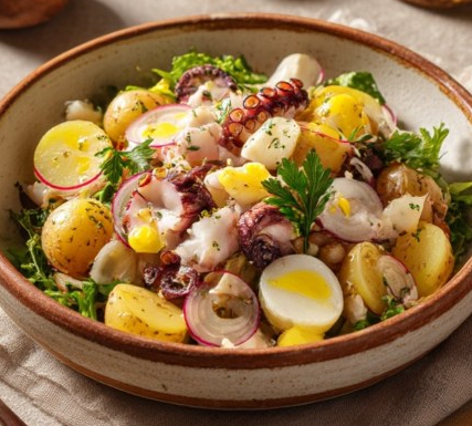 Ta ciepła sałatka z ziemniaków, ośmiornicy, jajek i rzodkiewki to danie inspirowane kuchnią śródziemnomorską – prostą, aromatyczną i opartą na jakości składników. Idealnie sprawdzi się jako lekki obiad, elegancka kolacja lub danie do podania gościom. Kluczem jest odpowiednie połączenie temperatur, delikatna tekstura ośmiornicy oraz cytrusowa, świeża vinaigrette.