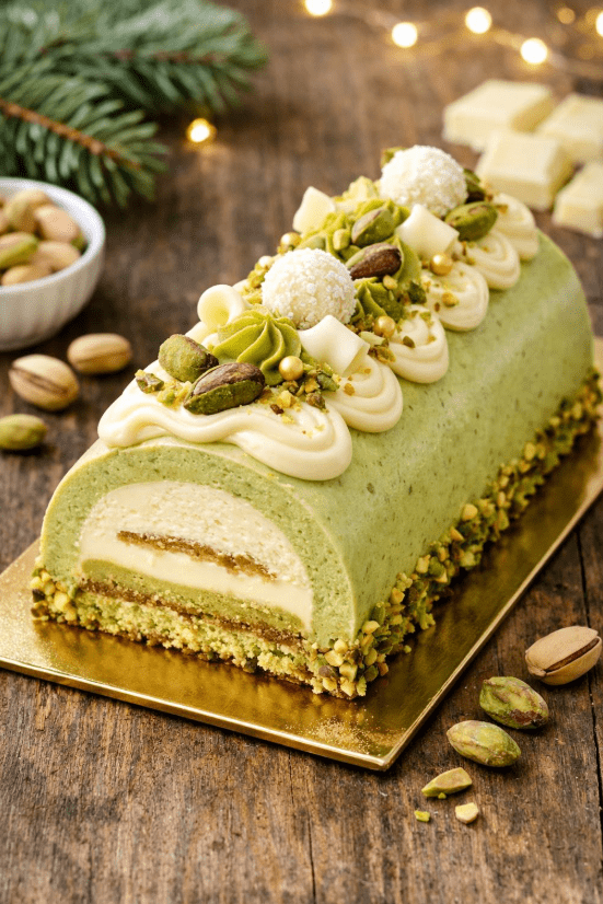 Świąteczny kloc z pistacjami i białą czekoladą to wyrafinowany deser, który łączy delikatność kremowego musu, intensywny smak pistacji oraz słodycz białej czekolady. To nowoczesna interpretacja klasycznego bożonarodzeniowego polana, idealna nie tylko na święta, ale również na eleganckie rodzinne spotkania czy uroczyste kolacje.