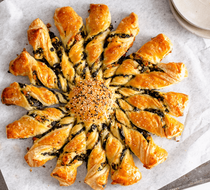 Połączenie delikatnego, listkującego się ciasta francuskiego z wytrawnym nadzieniem ze szpinaku i fety tworzy harmonijną całość. To idealna propozycja na rodzinny obiad, spotkanie z przyjaciółmi, świąteczny stół lub jako danie, które można postawić na środku stołu i wspólnie odrywać kolejne „promienie”.
