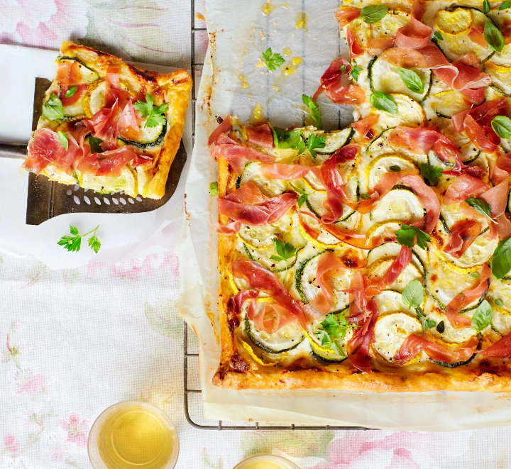 Tarta ziołowa z cukinią i szynką serrano to aromatyczne, wyraziste danie, które łączy w sobie chrupiące ciasto francuskie, kremowe nadzienie serowe oraz świeżość ziół. Delikatna cukinia i pikantna szynka serrano tworzą harmonijną kompozycję smaków, która sprawdzi się zarówno jako lekka kolacja, danie na spotkanie z przyjaciółmi, jak i wygodna propozycja na piknik.