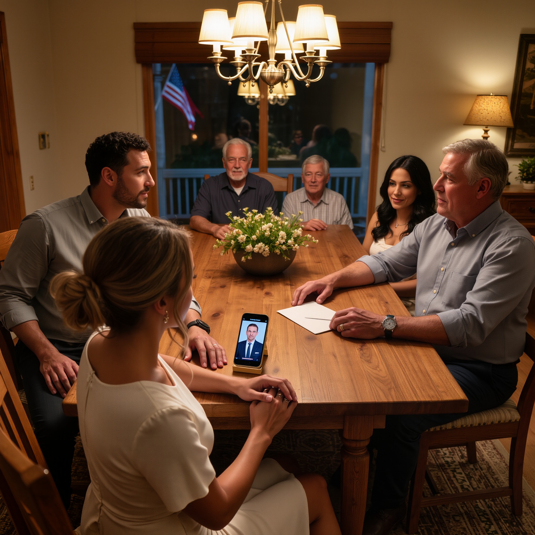 Marcus w końcu powoli wstaje, a jego krzesło z rozmysłem i precyzją szurając po drewnianej podłodze. Dźwięk przecina napięcie niczym ostrze i nagle uwaga wszystkich skupia się na nim. Sięga do tylnej kieszeni i wyciąga telefon, jego ruchy są spokojne i wyważone.