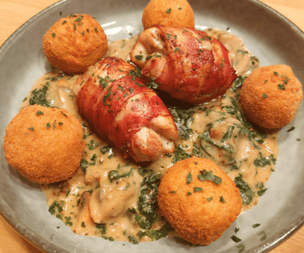Udka z kurczaka z boczkiem, kremowym sosem śmietanowym oraz domowymi krokietami to danie, które bez wątpienia można określić mianem prawdziwej kulinarnej rozkoszy. Soczyste mięso drobiowe, szczelnie owinięte aromatycznym, wędzonym boczkiem, zachwyca delikatnością i głębią smaku. Całość dopełnia aksamitny sos grzybowo-szpinakowy oraz chrupiące, złociste krokiety przygotowane od podstaw w domu.