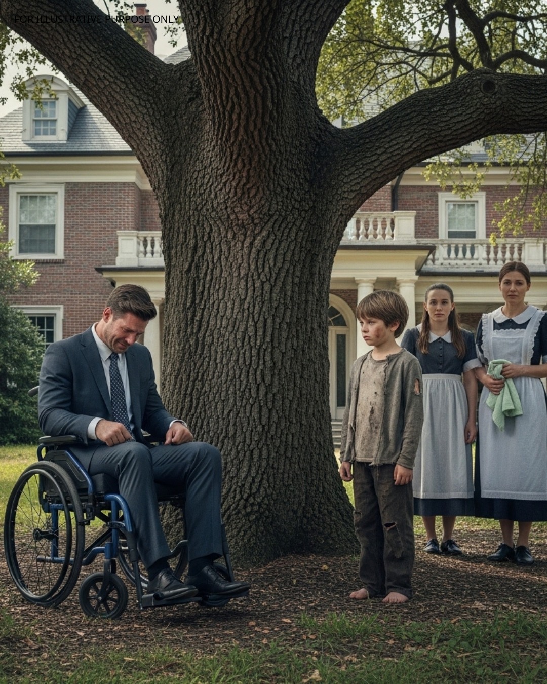 Chłopiec stał kilka stóp dalej, częściowo ukryty za krzakami róż, jakby próbował być jednocześnie odważny i cicho.