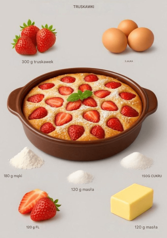 Wszystkie składniki powinny mieć temperaturę pokojową, co ułatwi ich łączenie i wpłynie na jednolitą konsystencję ciasta. Truskawki warto wybrać dojrzałe, ale jędrne, aby podczas pieczenia zachowały swój kształt.