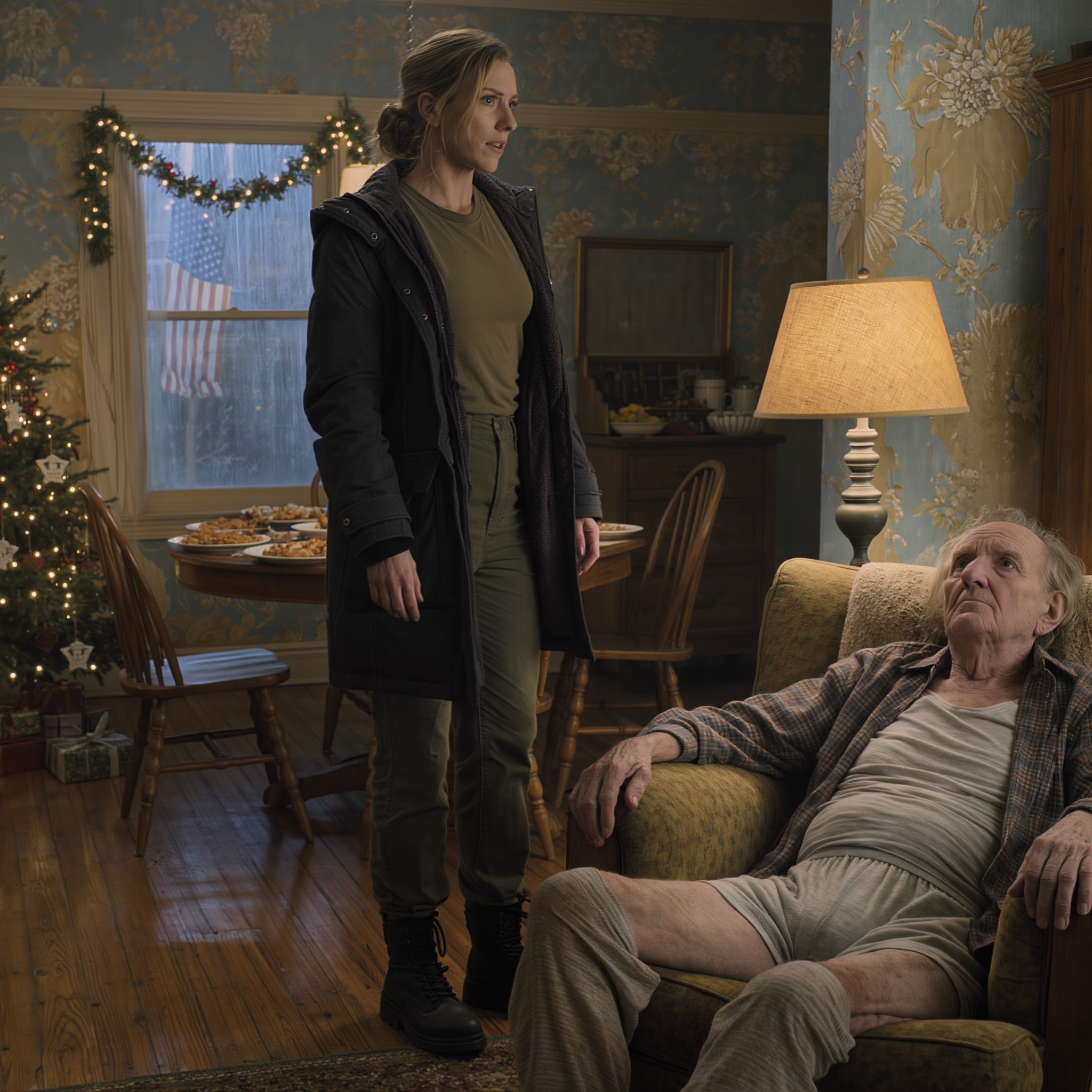 Wjechałem na parking Walmartu tuż przy autostradzie, dołączając do chaotycznego tłumu kupujących na ostatnią chwilę przed świętami. Automatyczne drzwi strzeliły we mnie sztucznym ciepłem i dźwiękiem Mariah Carey. Przemierzałem alejki z wojskową precyzją, chwytając 9-kilogramowego indyka Butterball, worek ziemniaków i dwie drogie butelki Cabernet.