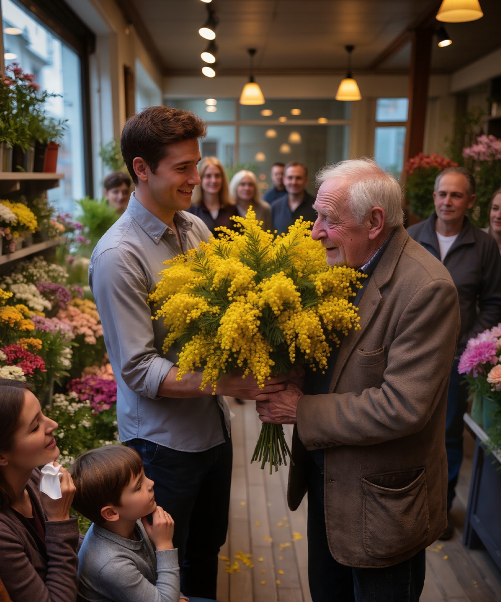 Starzec lekko spuścił wzrok i odpowiedział cicho, niemal przepraszająco: — „Przepraszam panią… Czy mogłaby mi pani powiedzieć, ile kosztuje gałązka mimozy?”