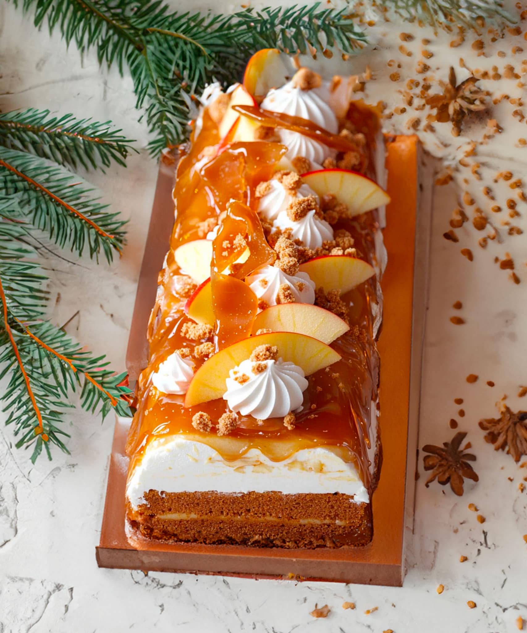 Ten wykwintny „kloc”, czyli efektowna rolada deserowa z solonym masłem karmelowym, karmelizowanymi jabłkami i speculoos, to prawdziwa uczta dla podniebienia. Łączy w sobie delikatny waniliowy biszkopt, głęboki smak domowego karmelu, owocową słodycz jabłek oraz charakterystyczną, korzenną nutę ciasteczek speculoos. To deser, który zachwyca zarówno wyglądem, jak i bogactwem smaków.