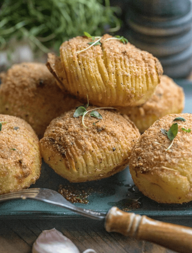 Ziemniaki Hasselback to prawdziwa klasyka wśród dań ziemniaczanych – efektowne, chrupiące na zewnątrz, miękkie i maślane w środku. Dzięki charakterystycznemu nacinaniu przypominają harmonijkę, co sprawia, że masło i przyprawy wnikają głęboko pomiędzy plasterki, nadając im wyjątkowy smak i aromat. W tej wersji ziemniaki zostały wzbogacone czosnkiem i tymiankiem, które idealnie podkreślają ich naturalną słodycz i ziemisty charakter.