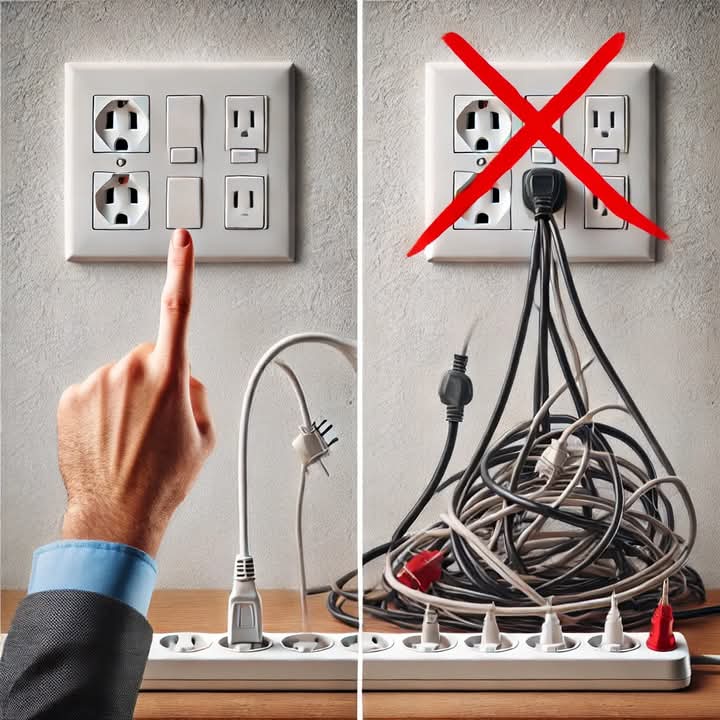 Bałagan spowodowany splątanymi lub przeciążonymi kablami w listwach zasilających zwiększa ryzyko przegrzania i zwarć. Zdjęcie przedstawia dwa przykłady: pierwsze zdjęcie przedstawia uporządkowaną instalację z jednym, dobrze zorganizowanym kablem, a drugie splątane i przeciążone kable z czerwonym krzyżykiem oznaczającym zły przykład. Przeciążone listwy zasilające mogą uszkodzić urządzenia, a nawet spowodować pożar elektryczny.