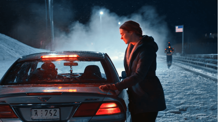 Dwie słabe pomarańczowe kropki mrugające przez śnieg na poboczu przed nami. Samochód zatrzymany na poboczu, prawie niewidoczny, z wyjątkiem tych desperackich małych sygnałów. W taką pogodę to zazwyczaj oznaczało kłopoty. Prawdziwe kłopoty.